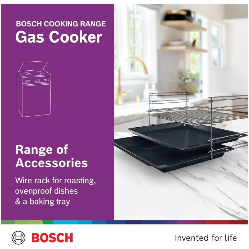 The Bosch Gas Cooking Range delivers strong performance for daily cooking. It offers reliable burners, safe operation, and a durable stainless steel finish. It includes a full gas oven, grill function, and German engineering for long-term use.