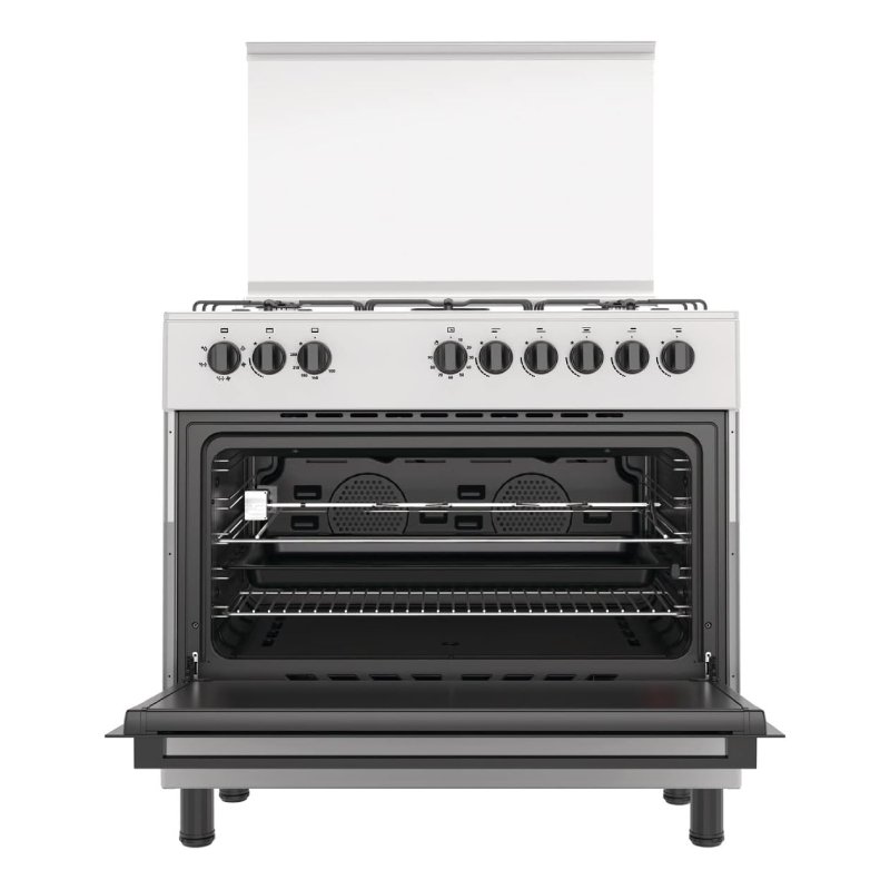 The Hisense 90cm Freestanding Gas Cooker features convenient one-hand ignition for easy operation. Its ergonomic knobs and clear markings ensure precise temperature and flame control.