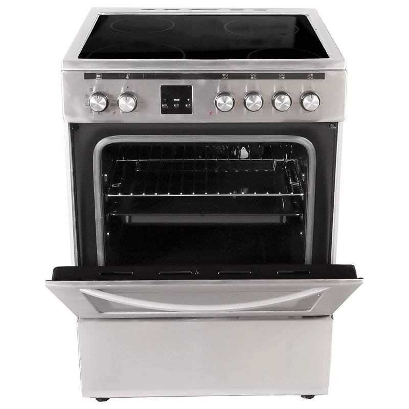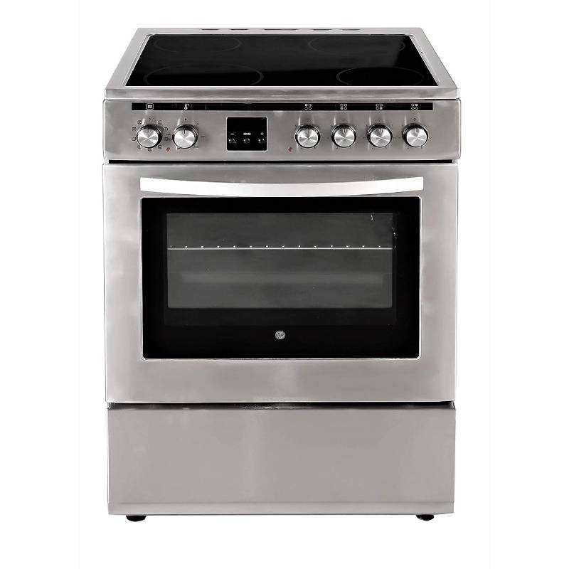 The Hoover 60×60 cm Ceramic Cooker FVC66.01S features 4 radiant cooking zones, a multifunction electric oven, and a grill. Made in Turkey with stainless steel finish and 1-year warranty.
