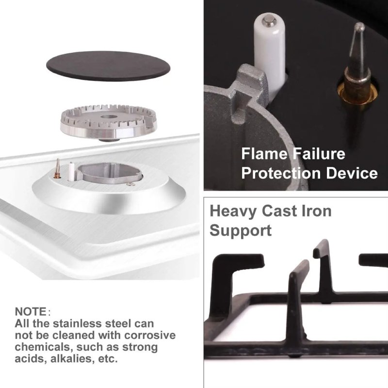 This gas hob features a sleek stainless steel body that resists rust, stains, and corrosion. The silver finish complements all kitchen interiors, adding elegance and practicality to your cooking space.