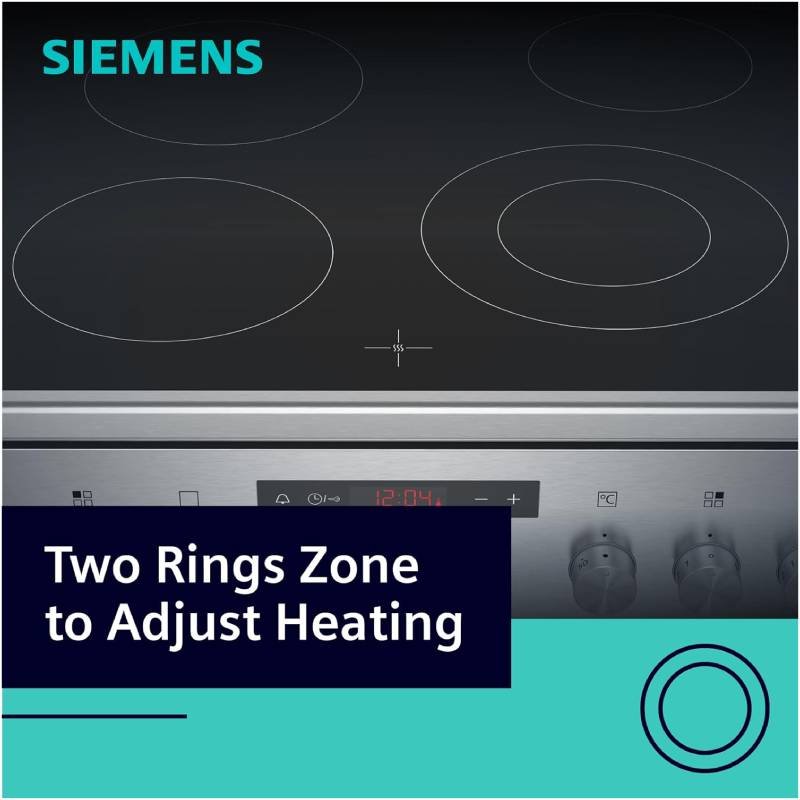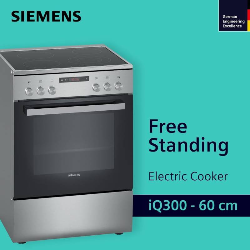 The Siemens IQ300 60cm Electric Cooker features a smooth ceramic cooktop, a 66L fan-assisted oven, and premium German engineering for efficient and even cooking.