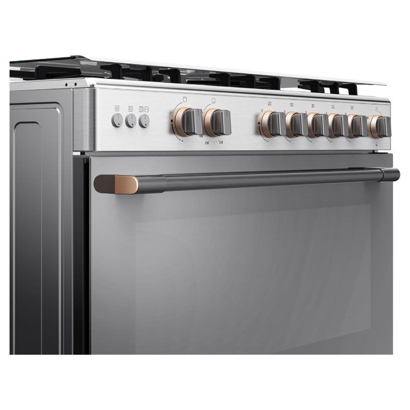 Equipped with auto ignition, flame failure protection, and a transparent oven door with interior light for clear visibility. The cast-iron pan supports ensure stability for heavy cookware.