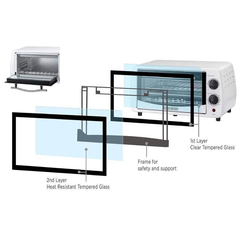 The Black Decker 9L Toaster Oven features a durable double glass door that retains heat while keeping the exterior cool. This design improves safety and energy efficiency during cooking.
