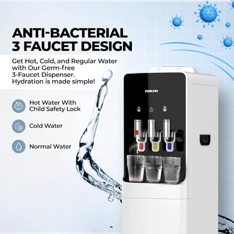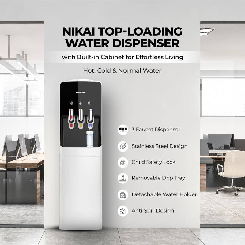 The Nikai NWD1400C Top Loading Water Dispenser offers hot, cool, and normal water with 3 taps, stainless steel tank, 16L cabinet, and low-noise operation.