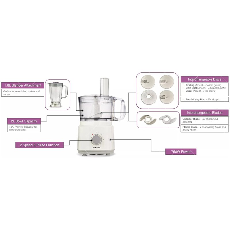 The Kenwood 750W Food Processor FDP03 is a versatile kitchen companion featuring multiple attachments, including a blender, whisk, and dough maker. It delivers excellent performance for chopping, blending, mixing, and kneading — perfect for home chefs at the best Price in UAE.